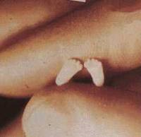 They are about three-eighths of an inch long. They are about one-quarter of an inch wide at the narrowest point, and about seven-sixteenths of an inch wide at their widest point. They would fit, with room to spare, on the average man’s thumb nail. What are they? They are the feet of an unborn child at ten weeks after conception. There is no mistaking what they are, for they are clearly human feet, complete with ten tiny, yet perfectly formed, toes.